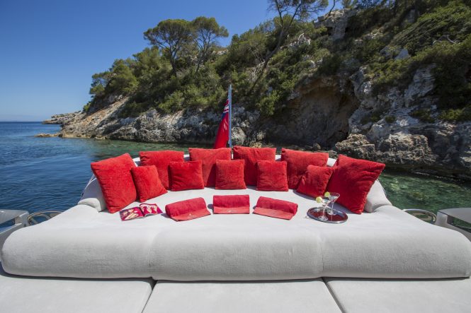 The 27m Pershing motor yacht TIGER LILY OF LONDON is offering the week of July 23 – 30 in the Balearics with 10% off the regular rate. Launched in 2008 and refitted in 2014, she accommodates up to 7 charter guests, in 3 cabins. The yacht’s naval architecture is by Fulvio de Simoni.