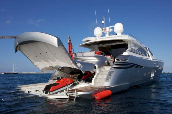 The yachts sleek planing hull design is painted in an attractive silver tone, she features 2 alfresco dining options, one on the aft deck and another forward. There are sun pads on the aft deck, foredeck and sundeck, allowing for plenty of exterior living. A great assortment of water toys is available from the extended swim platform.