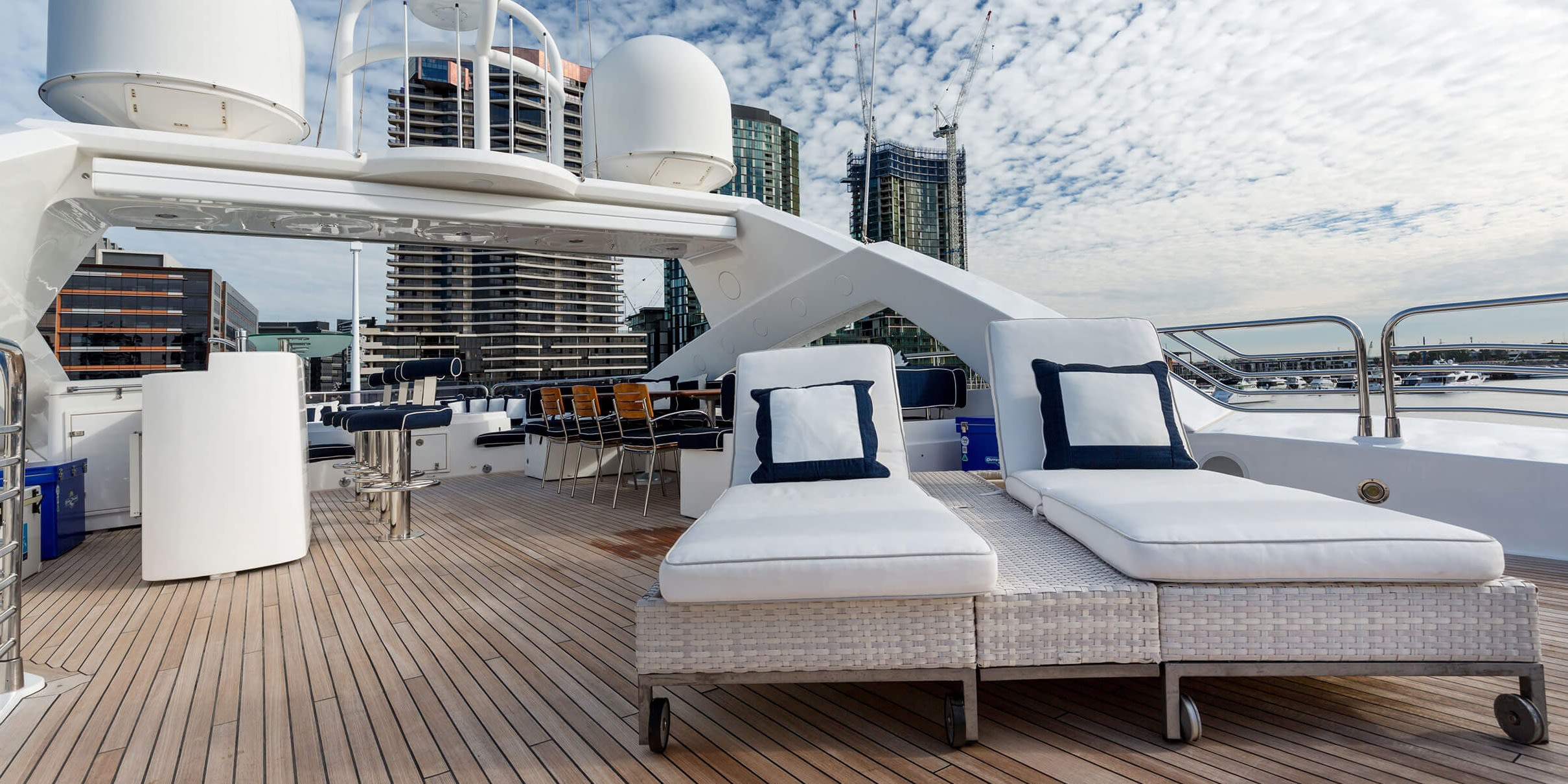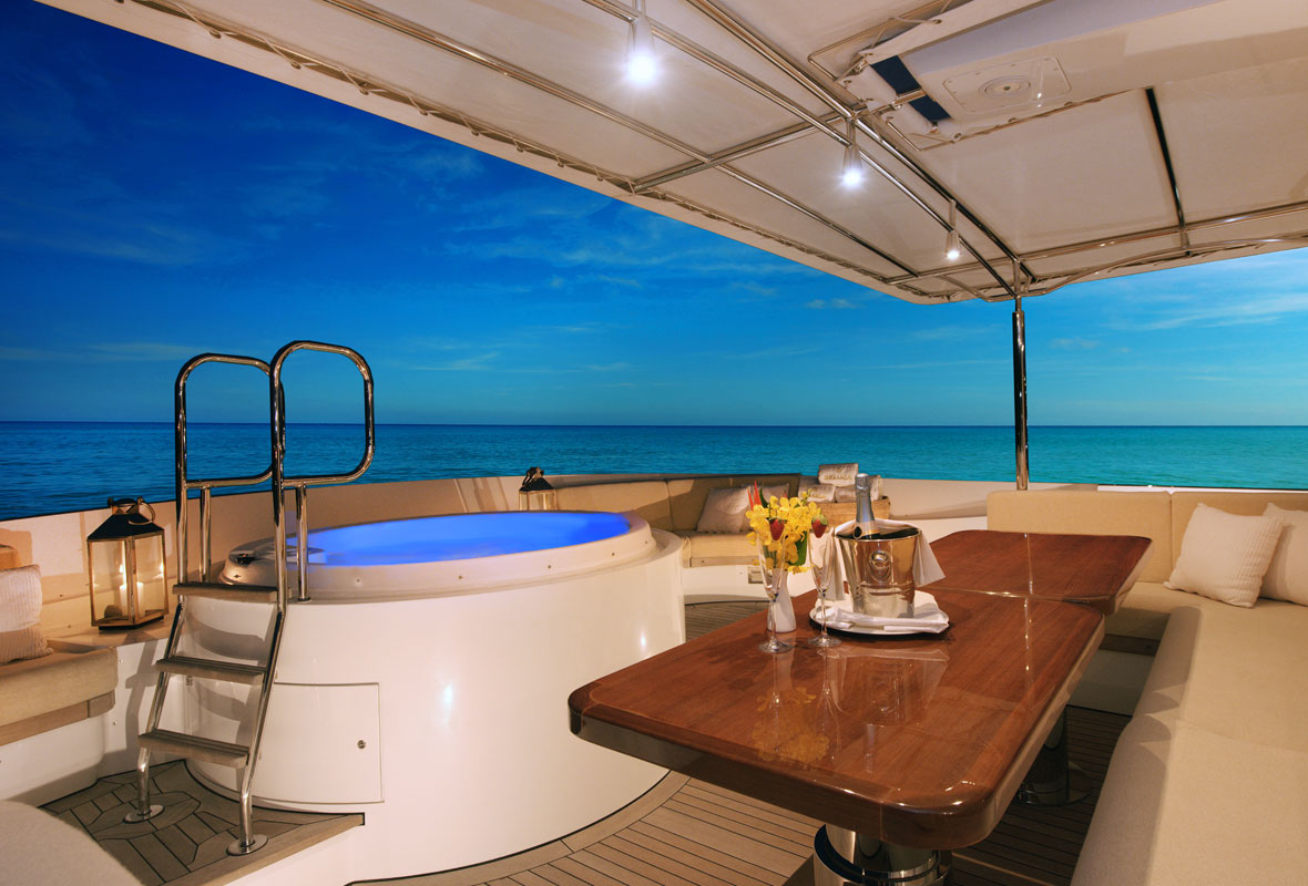 The upper deck aft is fitted with a Jacuzzi along the stern and the alfresco cinema will make the experience even more magical on summer nights under the stars.