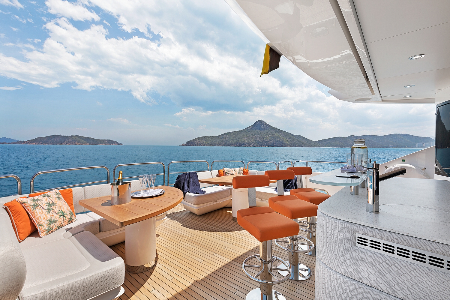 2018-built luxury yacht ONEWORLD from Gulf Craft is one of the newest vessels available for charter in Australian waters, and provides plenty of outdoor space for socialising and interacting with the environment. Top quality speakers are installed inside and out, and the broad foredeck offers uninterrupted views while dining or sunbathing. The flybridge aft Jacuzzi and sunbeds are conveniently close to the wet bar, and the shaded main deck aft is ideal for coffee mornings or dining alfresco out of the intense midday sun.