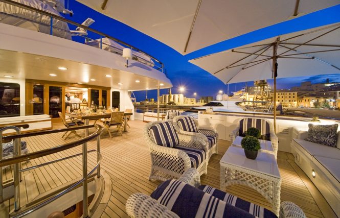 The sundeck is the place to be in warm weather, filled as it is with sunbeds, a Jacuzzi, sun-drenched dining and a wet bar.