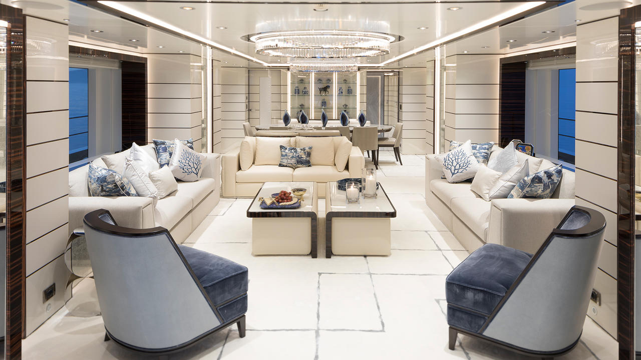 49.6m/163ft superyacht BLU 470 is at once elegant and energising in her modern interiors from Patrick Knowles: Original oil paintings complement the main cream and sapphire blue tones in the main salon, while the sklyounge has a laid-back atmosphere with a bar where guests can chat and watch the world go by after spending hours exploring the extensive water toys collection.