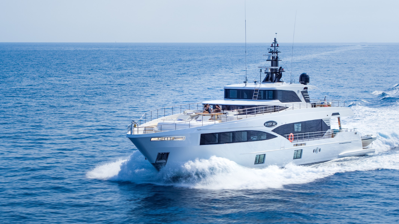 Luxury yacht ISLA is one of the popular Majesty 100 models from Gulf Craft. The pale, pastel-like colours of the interior are a perfect match to the beaches of the Balearic Islands, and she comes with a large collection of water toys for just such a destination.