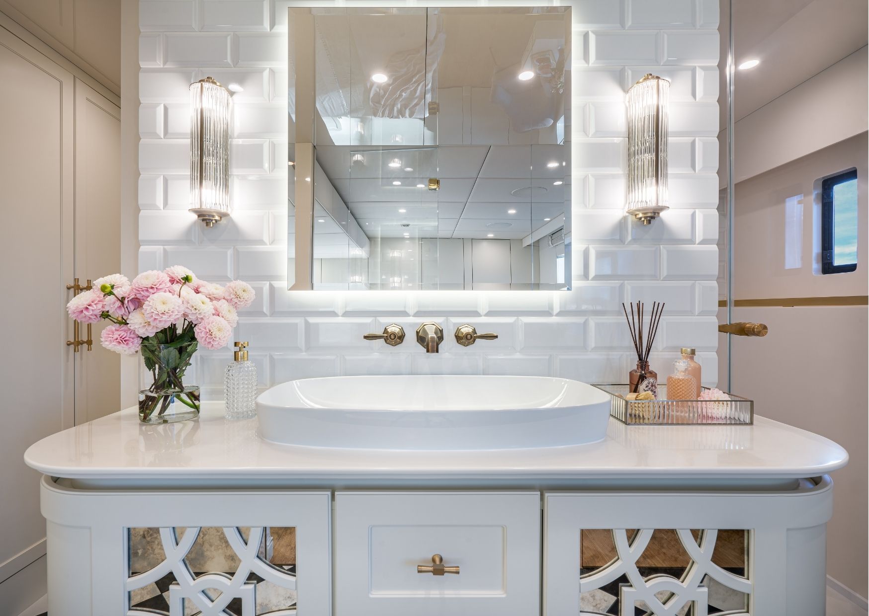 The interiors are styled with timeless elegance, using oak veneers, brass and rose quartz for accents. The main deck layout includes a gym with access to the foredeck and a galley with a bespoke bar.