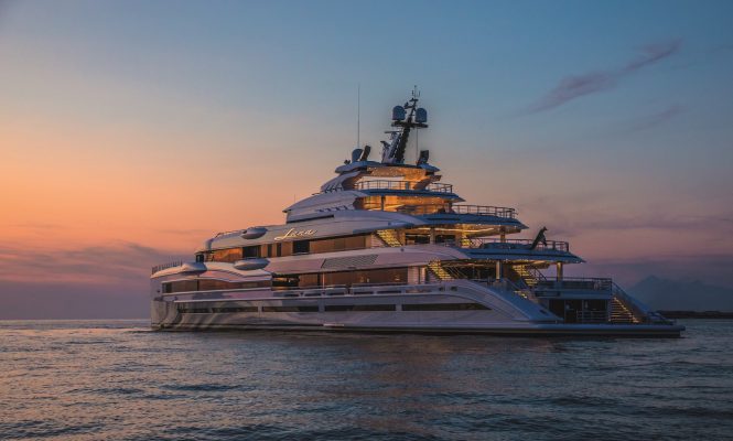 Among her award-winning features is a sun deck swimming pool, a grand piano, a spa containing a hammam, a massage room and gym, plus a touch-n’-go helipad. Her maximum beam is 15.2m/49.9ft and her interior volume comes to 3,300 GT to create spacious rooms on board, and the contemporary design makes use of large windows to flood the interiors with an abundance of natural light.