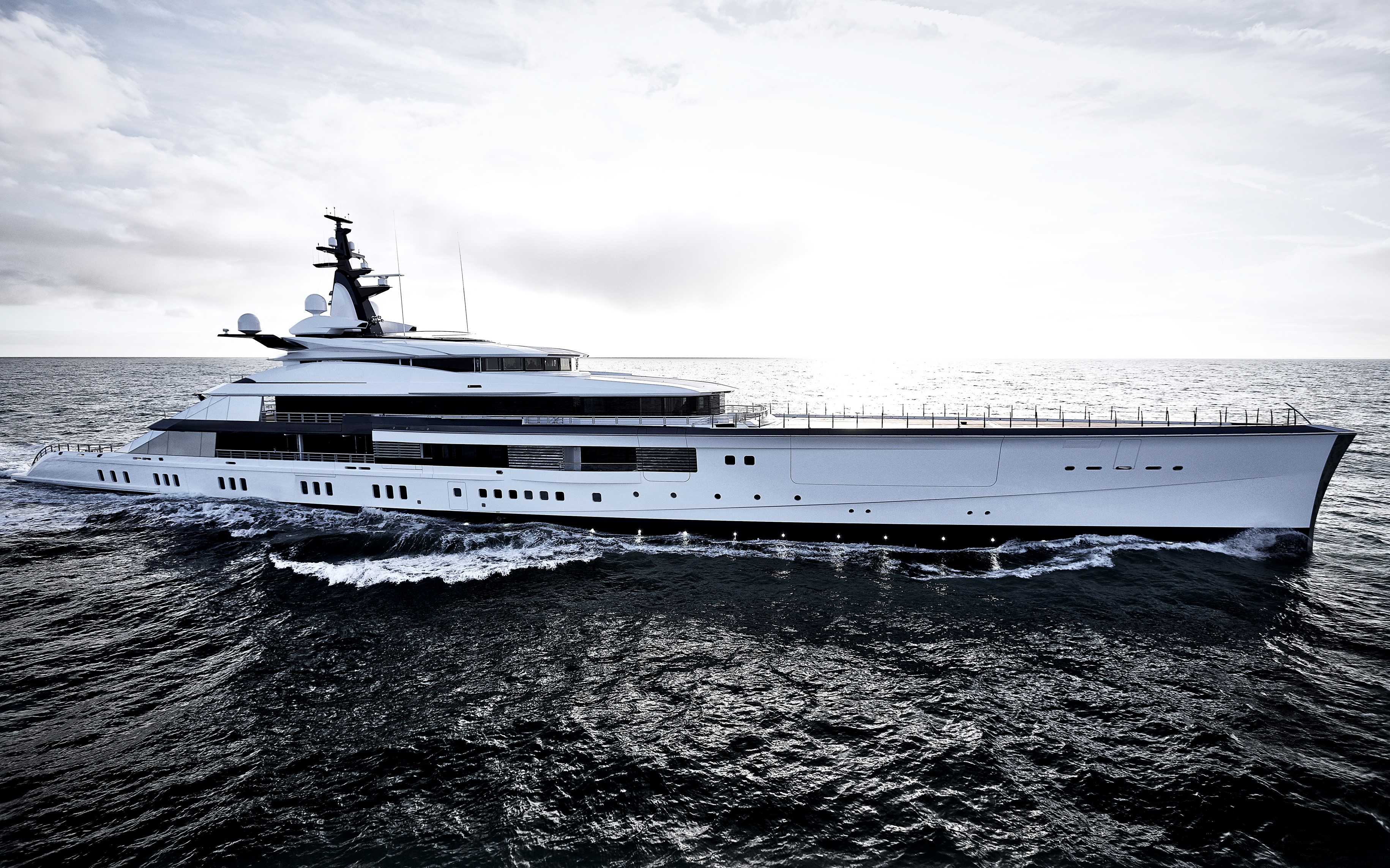 Nuvolari Lenard created a sporty low profile in silvery white, accented by a black waterline, bow and foredeck that further enhances her silhouette. The bow, in particular, has room for a helideck, and another helipad is placed to the aft. A sizeable tender garage allows for an extensive range of water toys to be stored on board, while the lower deck interior treats guests to a spa containing a steam room, sauna, massage room, plunge pool and rain shower as well as a gym and beach club. Reymond Langton Design chose light maple wood and white pearl lacquer with accents in ebony and walnut for contrast.
