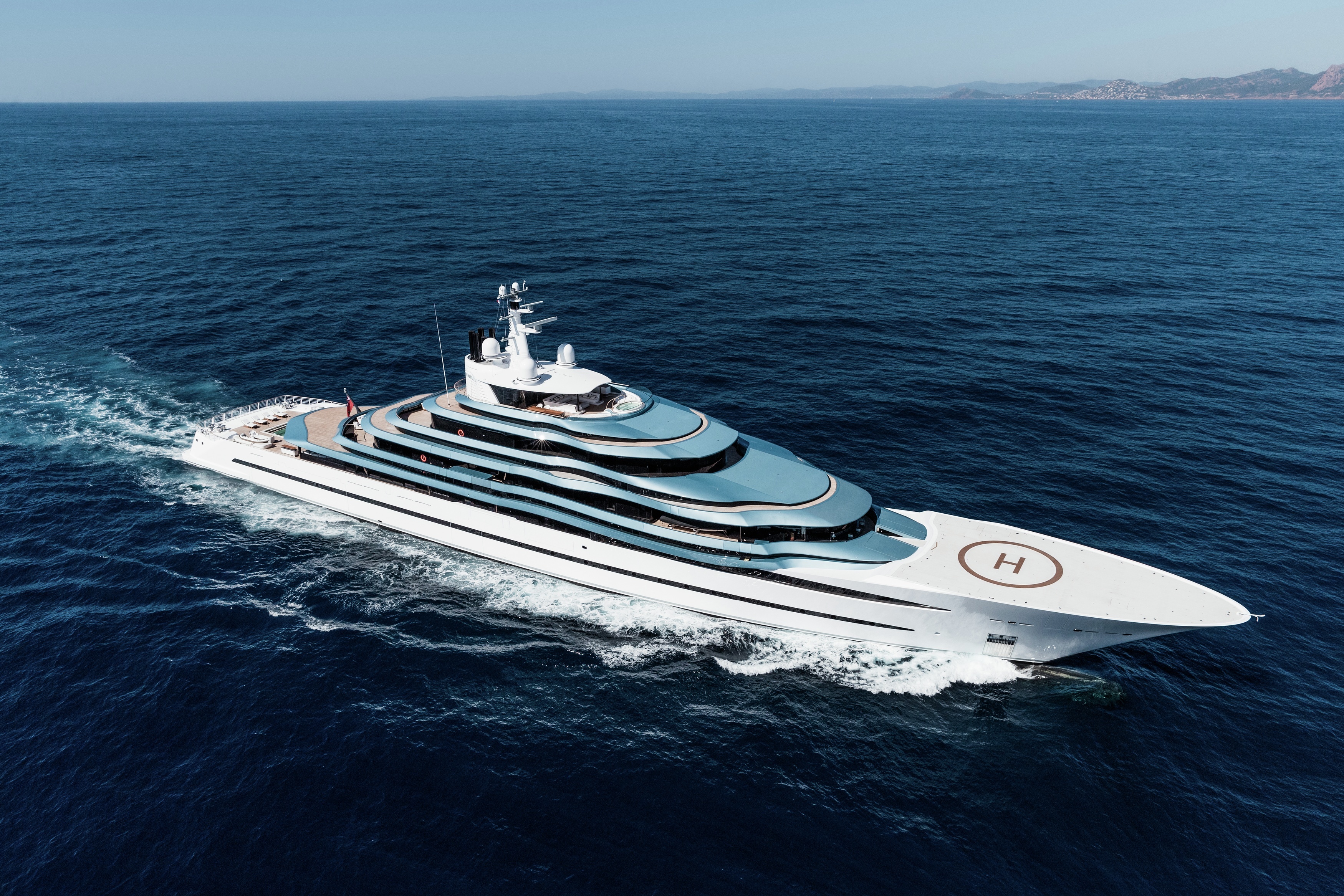 She measures 110 metres and can accommodate 30 guests in 15 cabins, which include four VIP cabins on the bridge deck, ten cabins on the main deck and a dedicated owner’s deck. A swimming pool is located in the centre on the main deck aft, and the flush foredeck hosts a large helipad which can also be used as a sunbathing area and lounge. A Jacuzzi is placed on the sundeck forward to take in panoramic views.