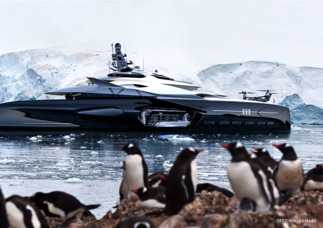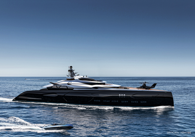 The Italian design studio Officina Armare has presented the new 110m/360ft concept PROJECT CENTAURO. The yacht boasts a futuristic exterior profile, which is not only trending but also takes inspiration from spacecraft. Her bold exterior lines and dark hull and superstructure create, you might say, a sporty look, but the design studio calls it a “Starship.”