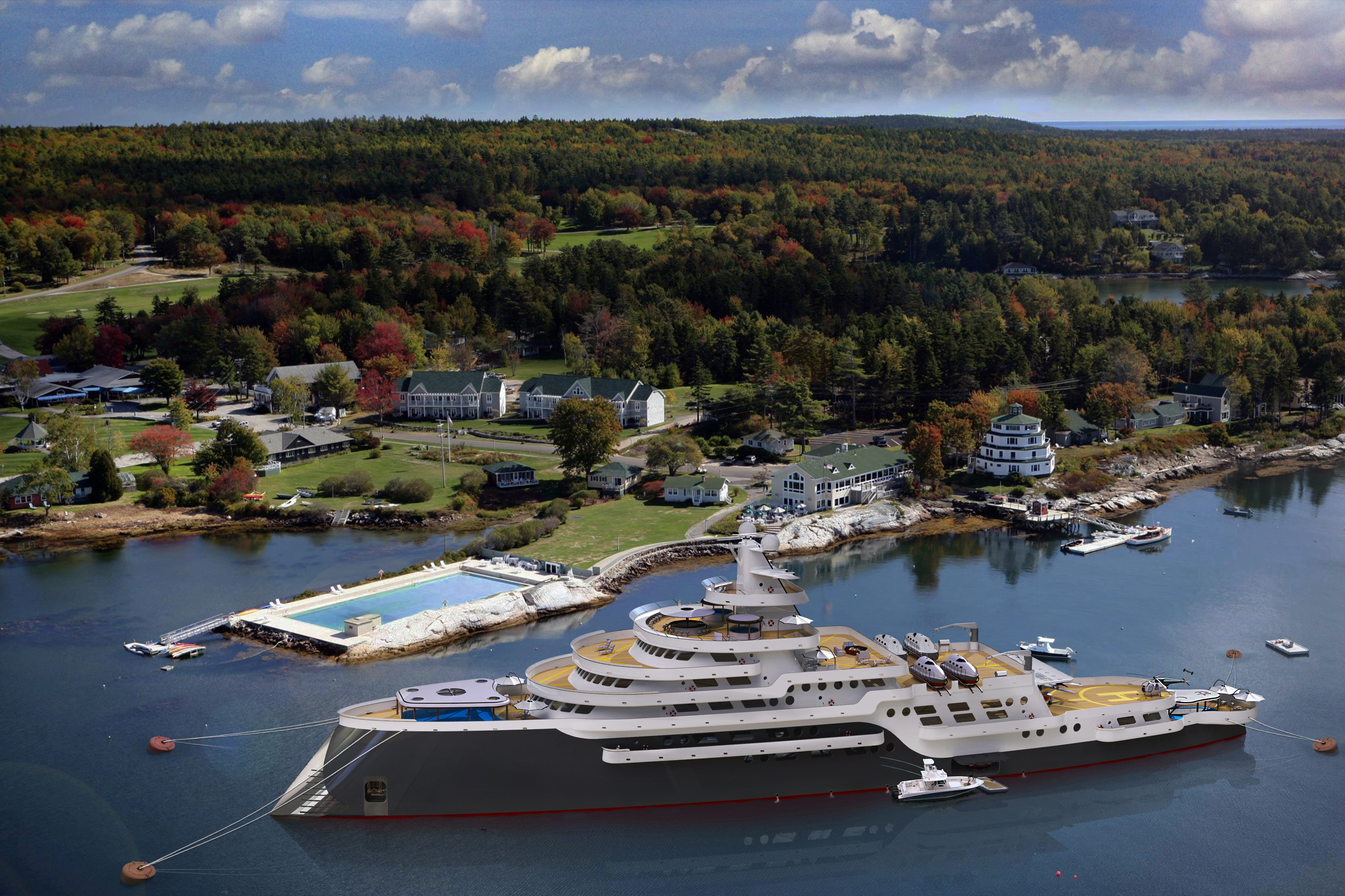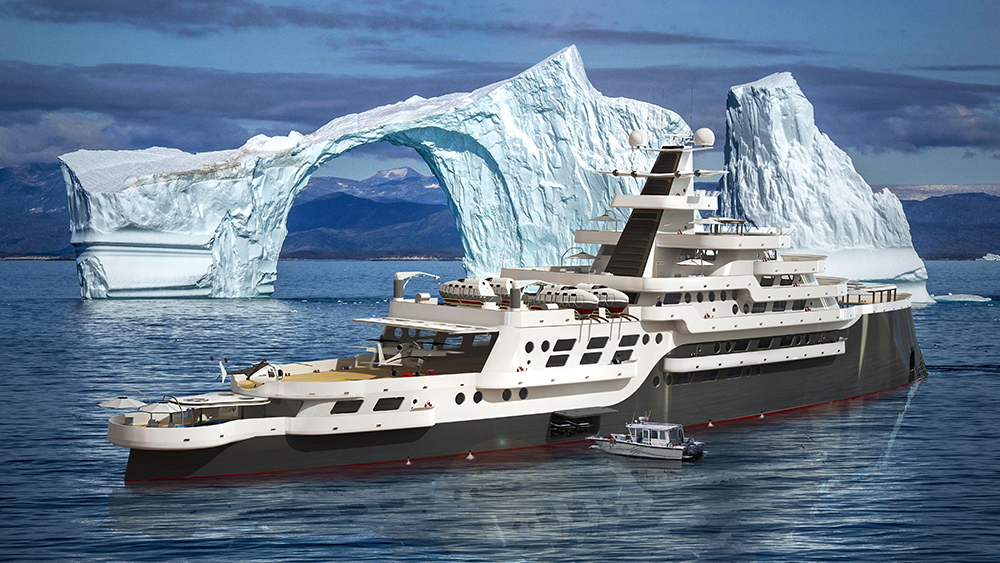 ALEXIS, part of the Goliath polar-explorer series is a fantastic megayacht capable of cruising in all weather conditions and even in the icy-cold waters. Her designer Steve Kozloff created a mindblowing exterior design featuring six decks, polar-class hull and a certified helipad, potentially making her an ideal expedition yacht or a luxury research vessel. The landing pad, as well as a huge 914 sqm/3000 sqft hangar for four helicopters, make it possible to land and take of in any conditions, crucial for around-the-world expeditions, where remote areas are not reachable by yacht.