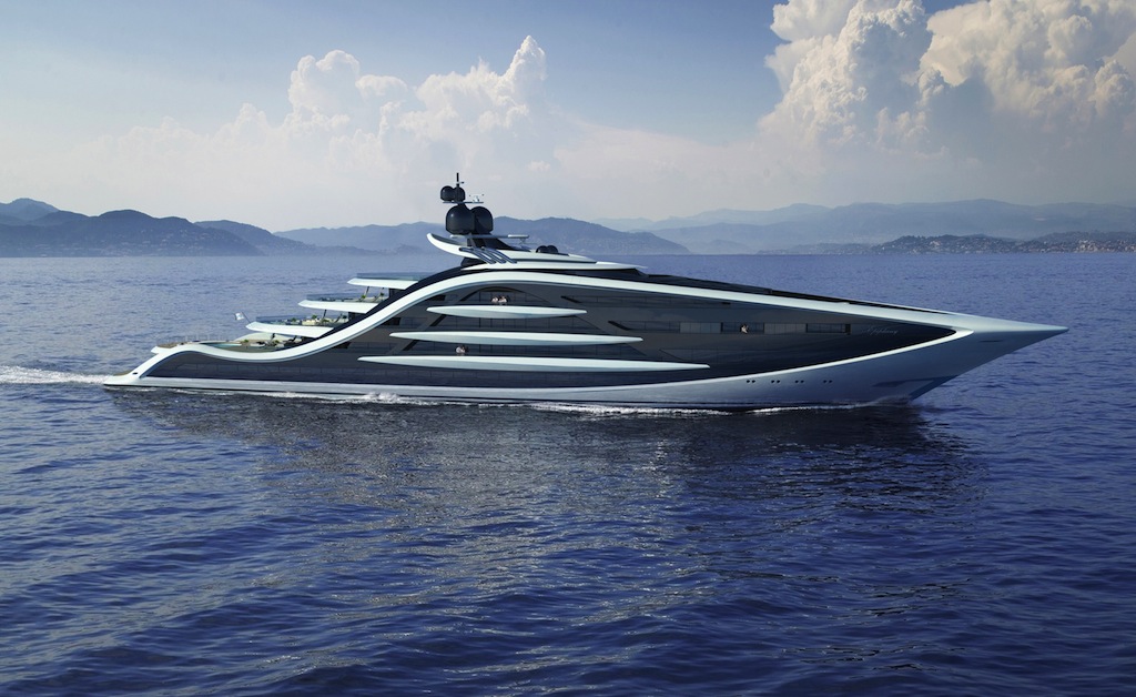 Measuring 130 metres, the latest creation from the drawing board of Andy Waugh, EPIPHANY boasts a striking silhouette and was inspired by a simplification of the ‘yacht form’ while emphasised by bold graphics. She is characterised by simple sophistication, making her a timeless superyacht concept with classic design features.