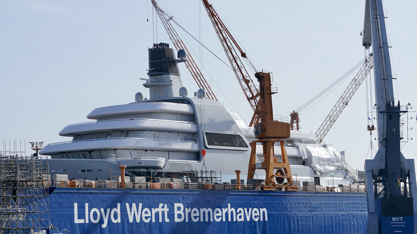 With 140 metres in length, mega yacht SOLARIS will undoubtedly be one of the most important launches of the year 2021. The below photos and the video by DrDuu show the yacht uncovered in preparation for her launch date. Solaris is being built by Lloyd Werft, builder of the equally impressive 115m LUNA, and will feature a grey hull and white superstructure.