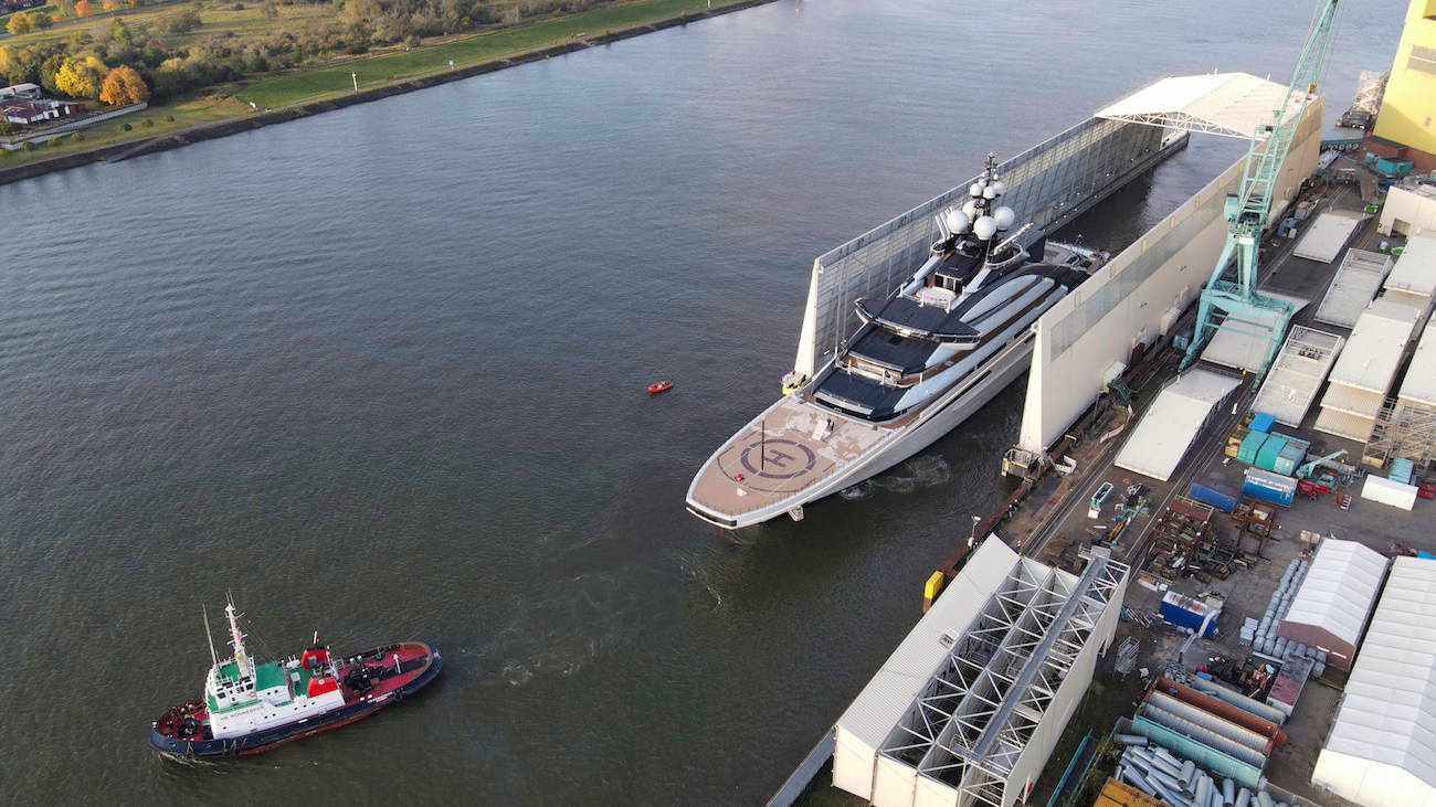 The 142m/465.8ft NORD yacht (previously OPUS) currently under construction at the Lurssen shipyard in Germany has once again floated our from her building shed, showcasing more details and features. Designed by Nuvolari Lenard, she certainly boasts striking exterior lines and, as seen from above, amazing deck spaces.