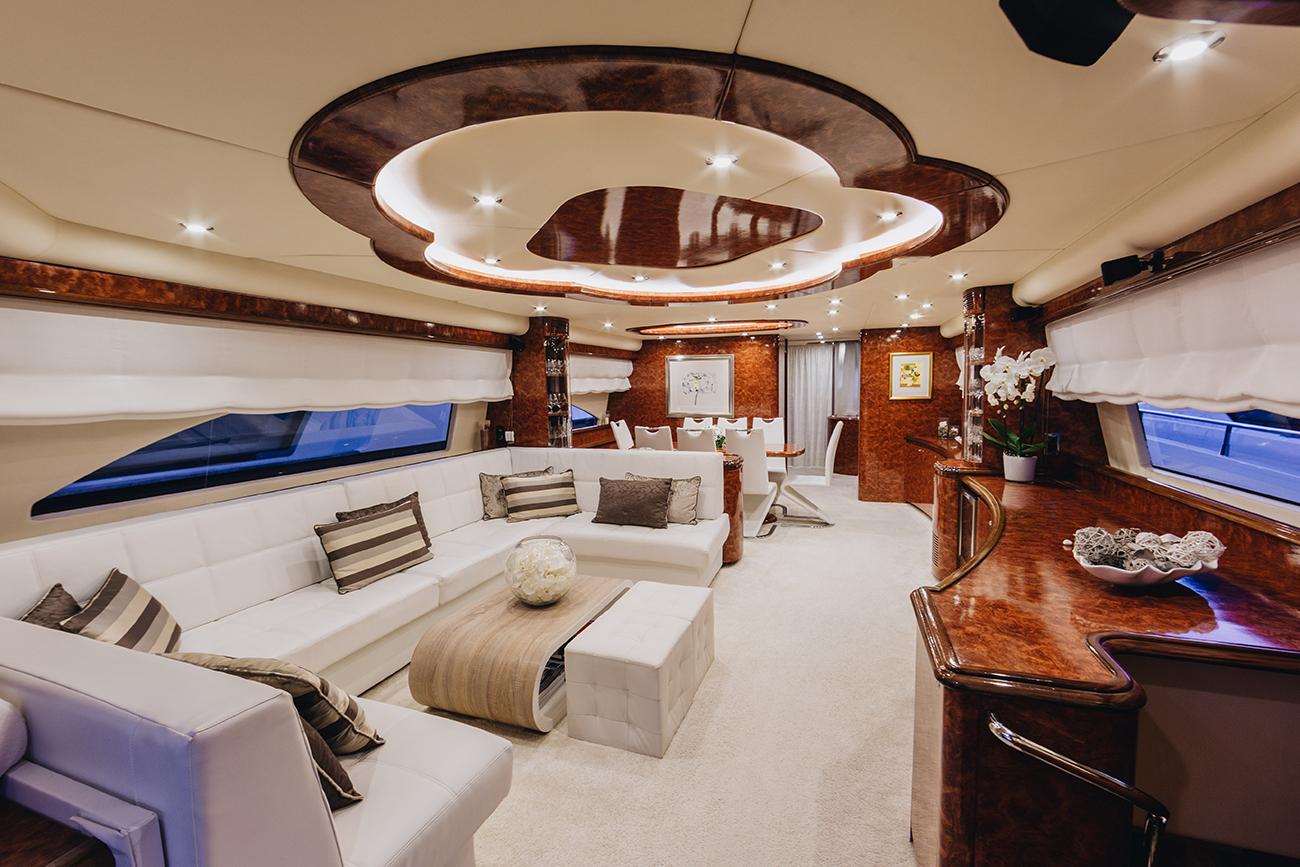 Contemporary interiors invite a relaxing elegant atmosphere throughout the yacht, from her social living spaces to the lovely guest cabins on the lower deck. The main deck hosts the salon and open plan formal dining, offering a large U-shaped sofa aft and on the port, with a stylish bespoke coffee table and ottomans centred. On the starboard side, there is a full entertainment section, with TV and Audio facilities. Forward, the formal dining table easily seats 8 guests. Neutral toned fabrics and beautiful burled woods, pair harmoniously under soft recessed lighting.