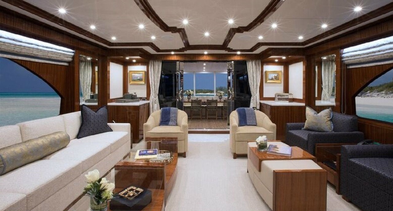 An elegant salon features beautiful woodwork, timeless furnishings and sophisticated detailing. Her lounge space is well-appointed with plenty of seating and natural light. Further forward a custom etched glass panel gives casual separation to the formal dining. To starboard is a hall which leads past the enclosed galley, to a full-beam master stateroom.