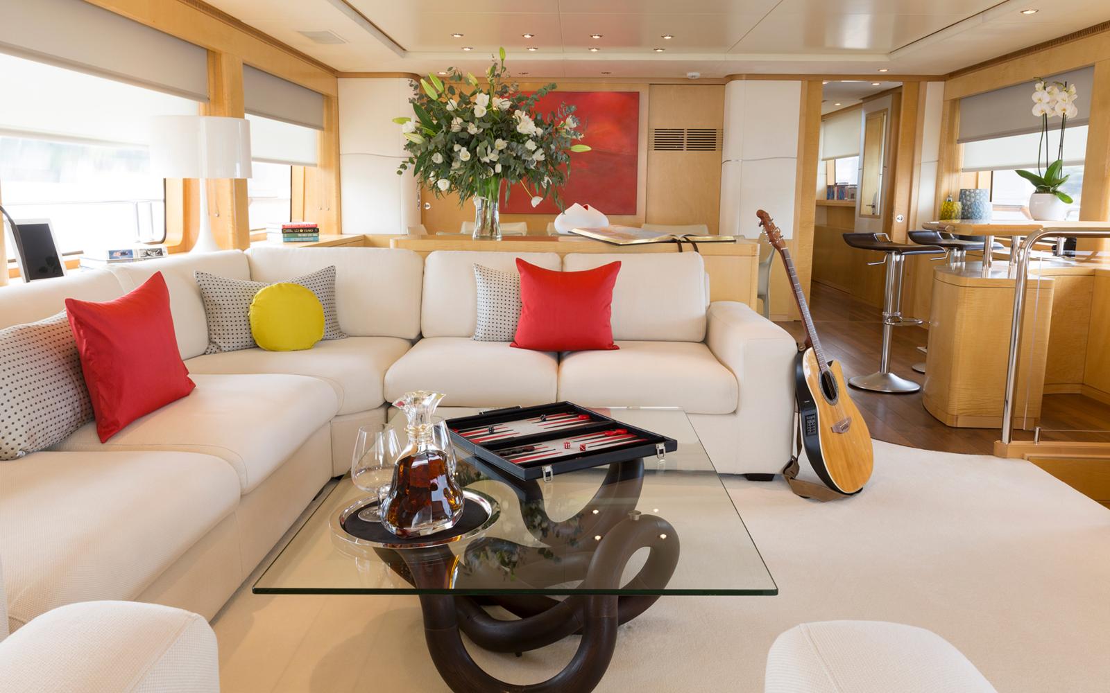 Featuring a bespoke décor by Sarah King Designs, SALU is elegant as much as she is stylish and inviting. An open plan salon ensures optimal socializing, it includes a spacious lounge, formal dining table and wet bar. On the main deck forward is the master, while below decks are 3 additional cabins, for up to 9 charter guests.