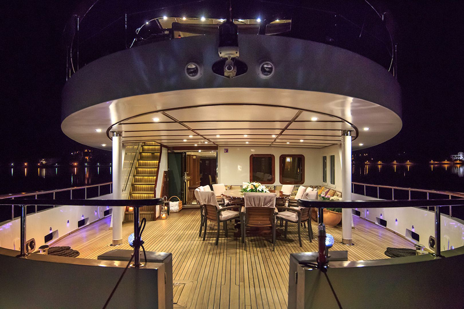 Day or night, the sundeck is a beautiful area for relaxation exposed to the natural elements with sweeping views of every destination you visit. As well as a second large [Jacuzzi, two generous sunpads convert into sun loungers and seating to the aft makes for a romantic evening spot for an alfresco meal at sunset.