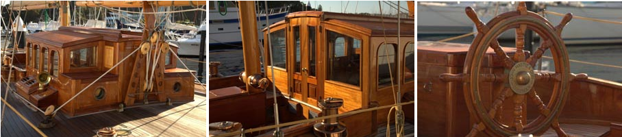 New deck included laminated beams ply sheathing and swept teak decking, bulwarks and teak caps. New brazilian mahogany deck structures include skylights, coach house, steering box and coamings.