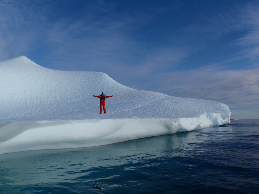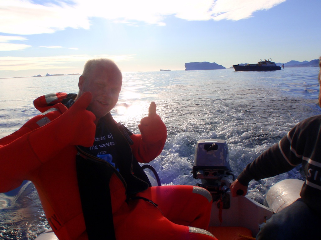 Bjarke donned a bright red US Coast Guard survival suit and was the first one to the dinghy. Richard drove the dinghy and pushed the nose straight into the berg and let the motor run so there was constant pressure between the two. With a successful dismount, the big red Bjarke was running around the ice. Feeling that everything was safe, Anders joined Bjarke and Richard stayed in the dinghy for security reasons.