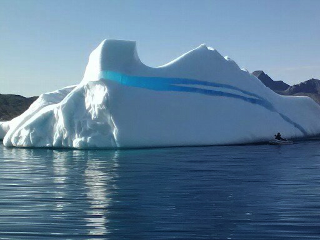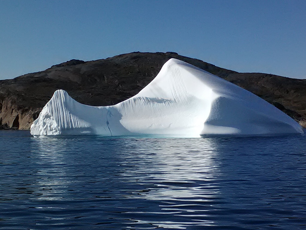 Just a few miles further east, Bjarke’s and Anders’ eyes lit up as we saw another iceberg we had to check out. Back into the dinghy and we were off. The right side had a gentle curve to the top, the left side was much steeper, but the two sides were about the same height. What drew our attention to this iceberg was that it gradually sloped to a perfect flat center, just about 3’ from the surface of the icy arctic water, providing us a perfect height to climb aboard.