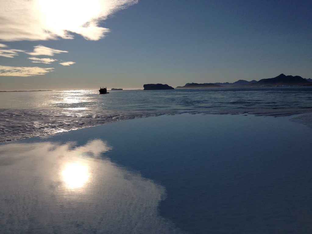 Climbing onto a huge chunk of ice was like stepping on the moon. Something you just can’t imagine, so beautiful and scary at the same time. Tossing the anchor onto the ice, the three of us met and played like little kids seeing snow for the first time. There was a shallow pool, maybe 20 yards across, where we all drank the coolest and most refreshing water ever. Climbing to the top was, to say the least, very difficult and slippery. We slowed as we reached the tiny summit because we didn’t know what was on the other side. We were climbing with our hands and feet, but when we reached the top, we were able to stand and face a perfectly blue lake, about 80’ across, with the sea between us and the mountains of Greenland. Though it was so inviting to try and go swimming, we were sure the shock of the ice cold water would paralyze us. Instead, we slid down the hill we had just climbed. Not with a sled, or disk, or chunk of plastic, just on our rears, our backs and arms, laughing all of the way. We had too much adrenaline to feel how cold we should have been and, after a few moments of reflecting on where we were, what we had just seen and done, we got back in the dinghy and headed back to ZERLINA.