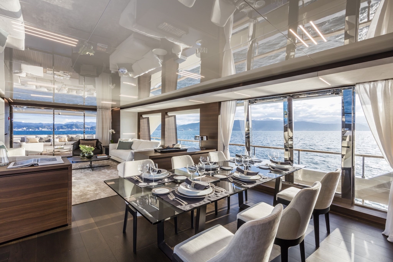 The interiors are chic and elegant with areas for everyone to relax and entertain. She has an open plan salon and dining layout, ideal for any occasion, this space has the lounge aft and table forward. An upper sky-lounge boasts a further lounge with large sofa. On the main deck forward is a full beam master stateroom, while on the lower deck are 4 guest cabins, comprising 2 generous queen cabins and 2 twin cabins with a Pullman each. In addition, one of the twin cabins converts to a double.
