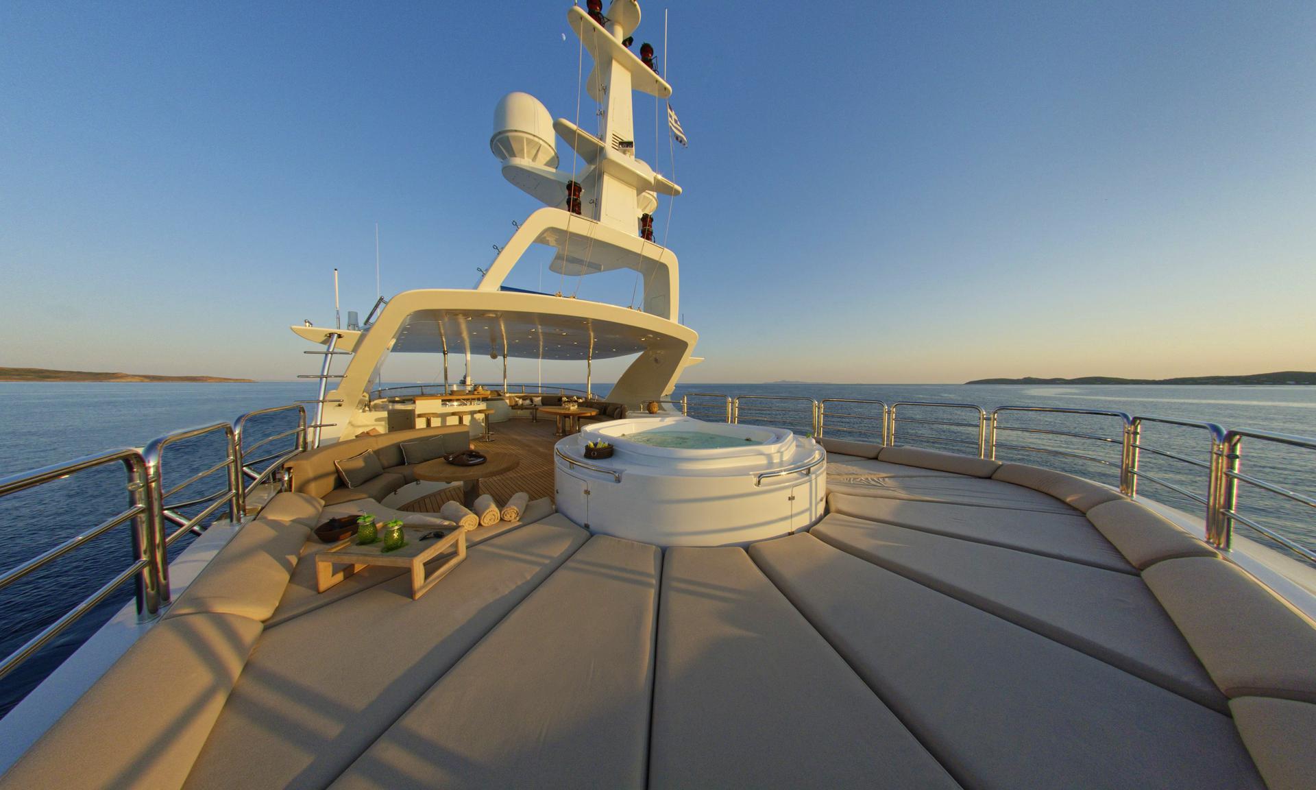 Up to the bridge deck aft, there are numerous sitting areas with cocktail tables. The sundeck certainly impresses the most discerning of charter guests, offering a luxurious jacuzzi, casual dining, large sunbed, complete drinks bar with seating and partial shade.