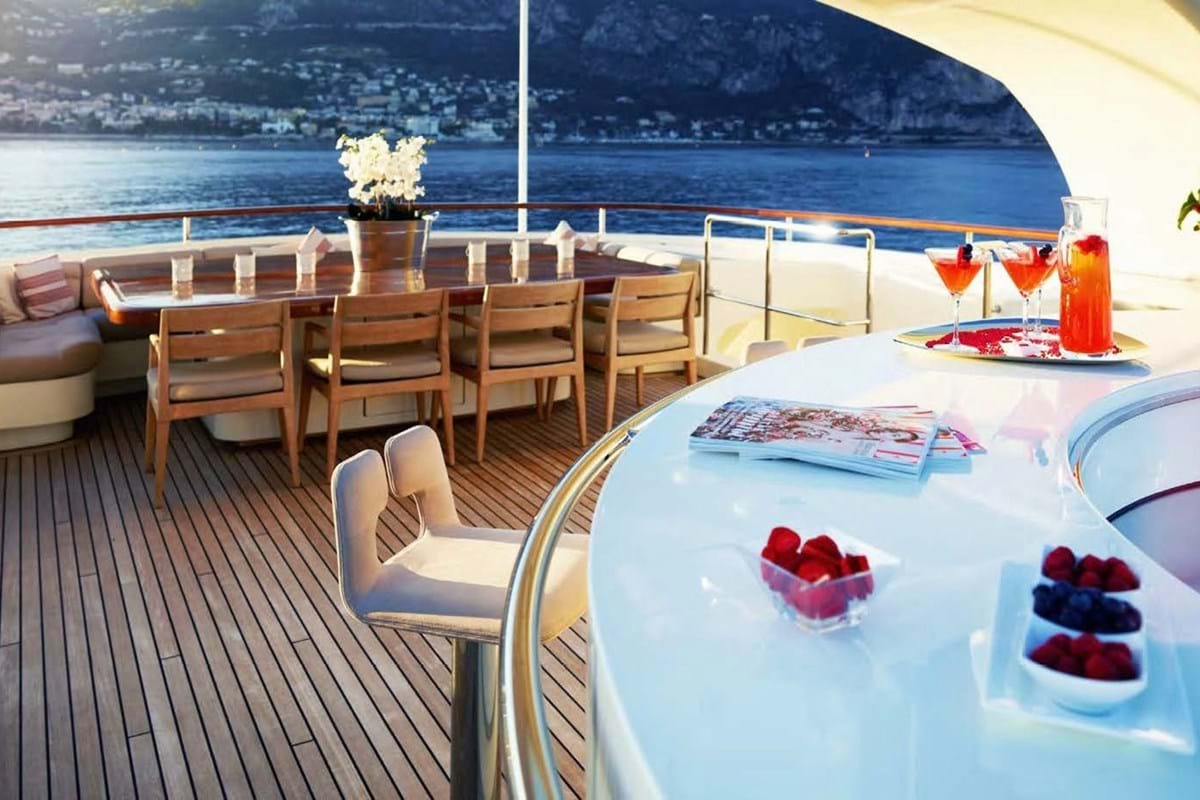 M/Y GHSOT III has excellent areas outdoors to enjoy the east Mediterranean summer sunshine. A shaded aft deck on the main level offers alfresco dining and built-in sun pads. Her upper deck aft has comfortable lounge seating. There is a well-appointed sundeck, complete with dining, sunning and a jacuzzi. For an added bonus the Acico yacht boasts a generous Portuguese bow with wrap-around U-shape seating and a casual drinks table.