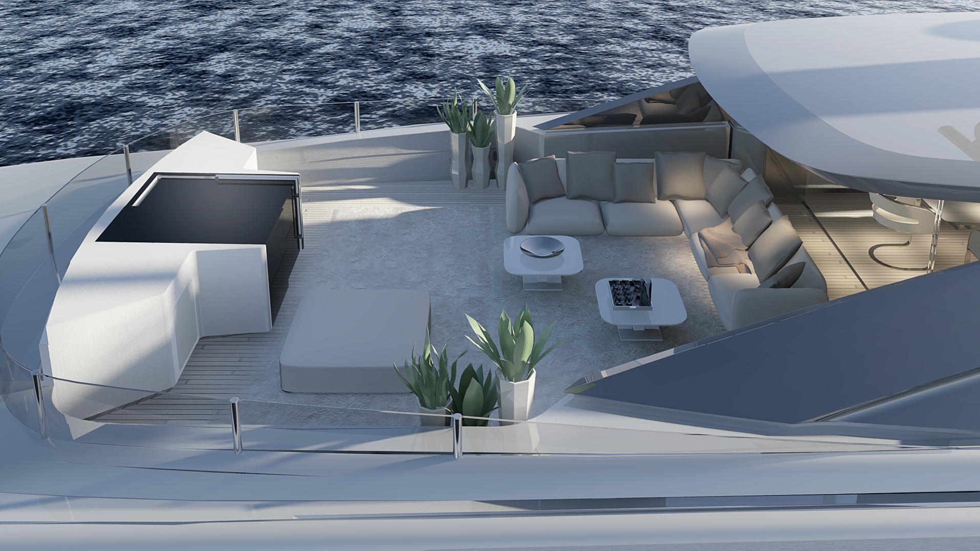On the outside the deck offers various possibilities for sunbathing lounging around or entertainment. There is an al fresco dining table on the aft deck shaded by a Bimini cover. The main decks wrap-around the yacht, leading to the vast foredeck fitted with sunbeds.