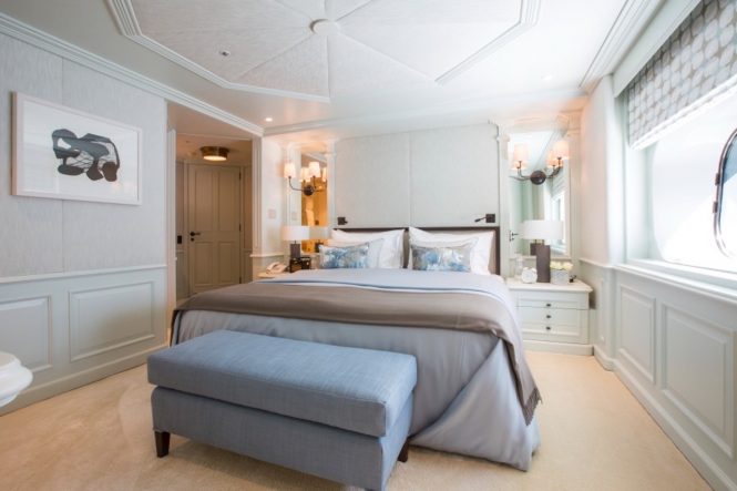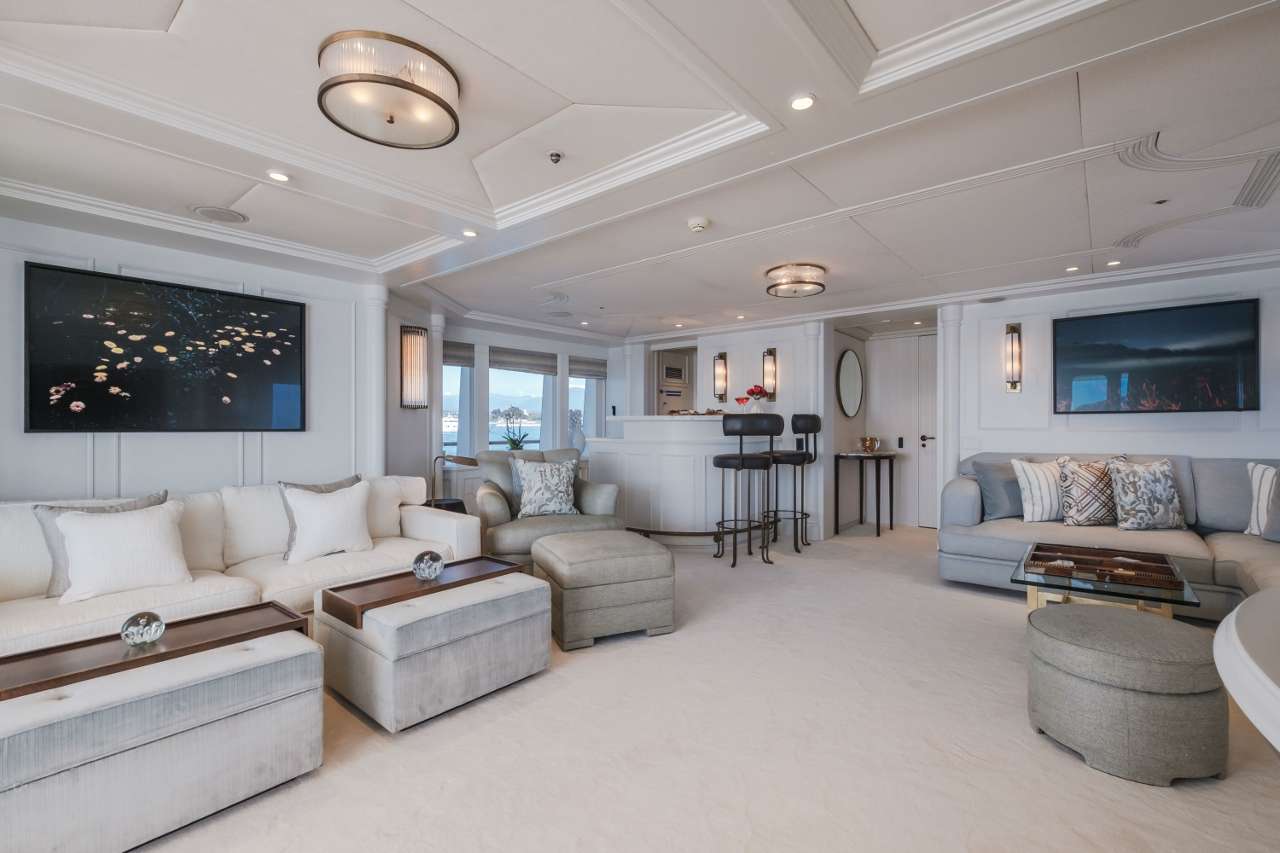 The main deck perfectly blends contemporary aesthetics with art deco styling to create luscious living spaces suited to daytime contemplation and night-time entertaining. The formal dining area is located forward and provides a more intimate dining experience, separated from the salon by glass sliding doors. White-painted panelling and a broad beam come together to create an impressive space where guests can gather for a family film after a meal or catch up over drinks. On the main deck aft, the upper deck overhang creates a shaded space where guests can rest on the arm chairs and watch the world go by, or sit at the stern lounge to have an alfresco breakfast before taking a tender from the swim platform to the nearby shore.