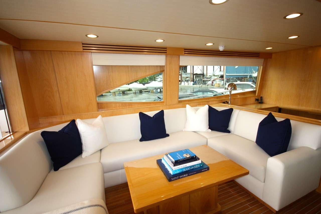 Her contemporary interior décor is simplistic and clean, with neutral furnishings and warm wood panels. The main salon boasts a social lounge and bar, ideal for evening cocktails with family and friends. Step out from the salon onto a generous aft deck and alfresco dining. Wander forward to an additional seating area and sun pads.