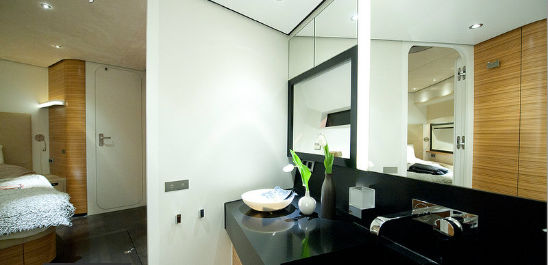 Acico luxury yacht AY74 provides three comfortable cabins, comprising the full beam owner’s room, as well as two guest cabins. There is also a crew cabin for two with an independent wash room. Unique for her size is the laundry and the large, fully equipped galley. The open arrangement between lower and upper deck generates a transparent and spacious feeling.