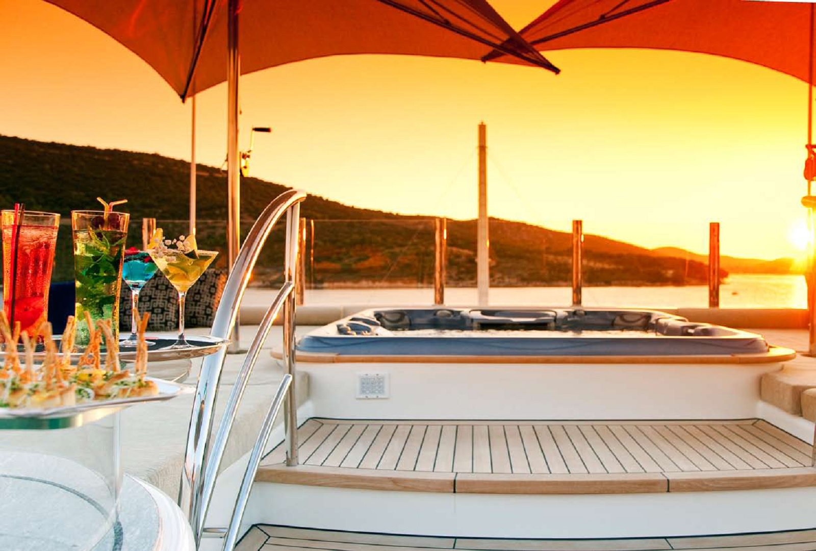 Exterior living aboard the MARY-JEAN II is laid over 3 levels, which include an aft deck with comfortable seating, an upper aft deck with alfresco dining and a bar, perfect for evening refreshments and memorable meals. On the sundeck, the Ancona has a further alfresco dining option, bar, entertainment, sun loungers, sun pads, jacuzzi and day head.