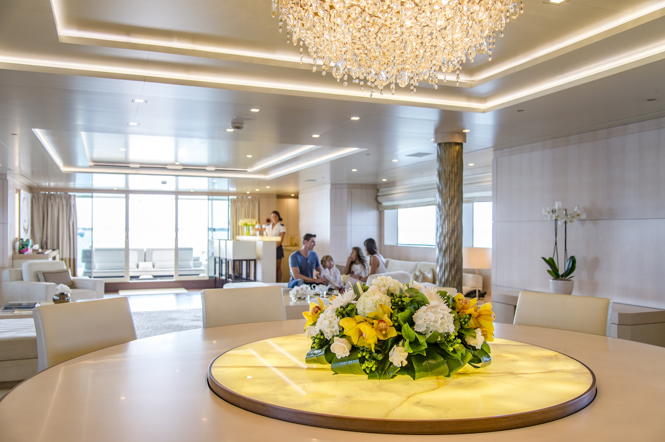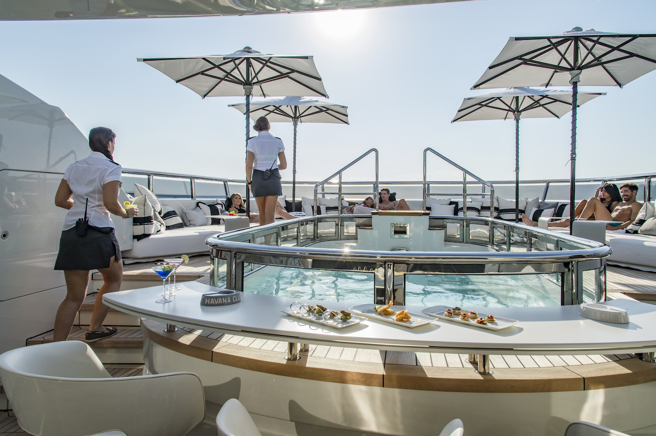 Exterior living aboard the M/Y ROMA is over 3 decks, including a shaded aft deck with seating and direct access to the swim platform, where charter guests can make the most of the vast assortment of water toys available. The upper aft deck has seating, sunning areas and an alfresco dining table. The sundeck is impressive and well-appointed, perfect for luxury charters in the West Mediterranean, here the is alfresco dining, sun pads, wet bar and oversized Jacuzzi.