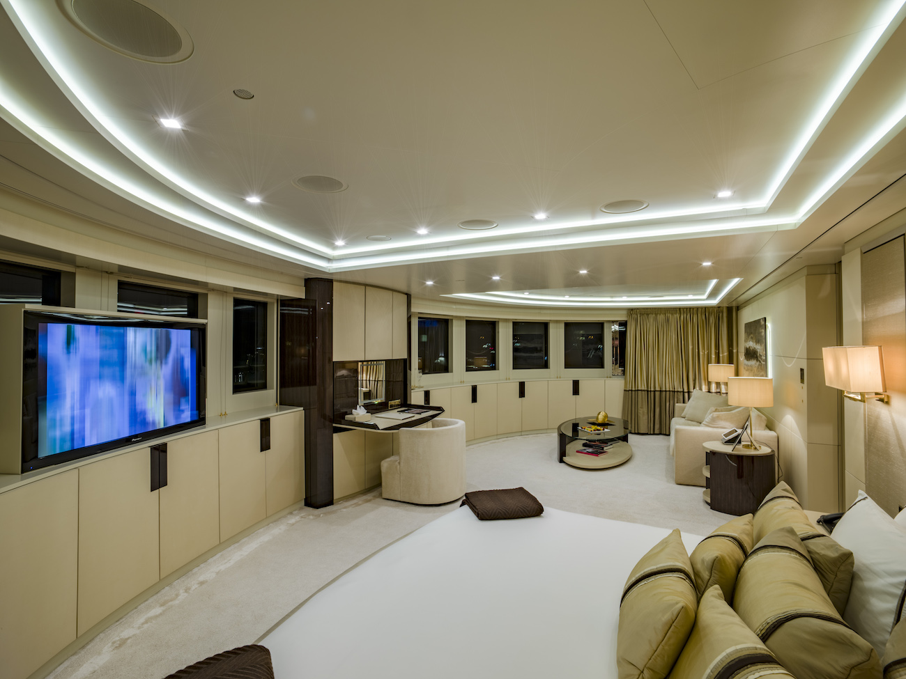 Accommodation is over 6 cabins, for 12 charter guests. Roma’s master stateroom is on the main deck forward taking in 180° views, a king size bed and private lounge. Three cabins on the main deck comprise 3 VIP cabins. There is a double cabin on the upper deck and a twin cabin on the lower deck.