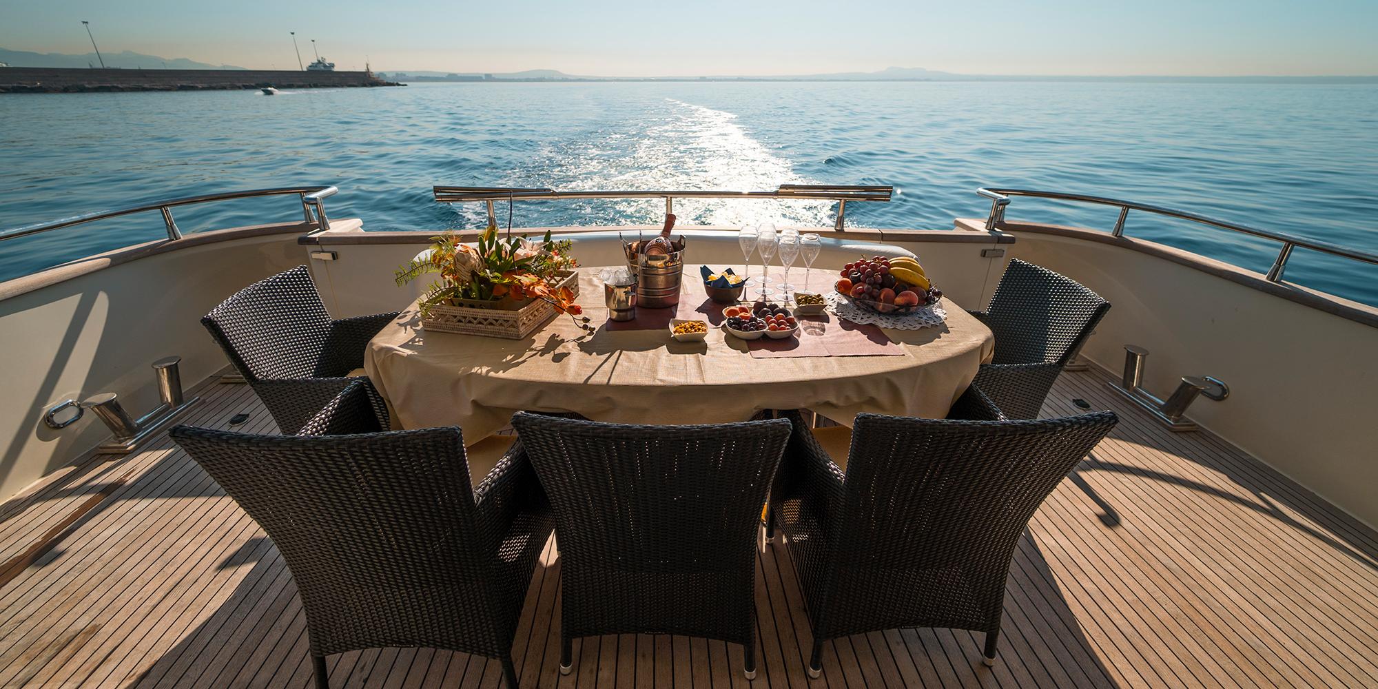 The yachts interior styling is timeless, offering warm high gloss woods, white overhead panels and a striking pairing of neutral contrasting dark tones, creating a clean, crisp ambience. The salon is open plan with the lounge aft, while positioned forward is her formal dining. Forward of the salon is the bridge deck, which offers additional seating, while aft of the salon, doors lead out onto a shaded deck, featuring alfresco dining. For the water enthusiasts, steps lead down to a swim platform, alternatively, sun worshipers can enjoy the built-in sunbeds on the foredeck. An upper deck is reached from both the aft deck and the salon, here the Canados yacht offers further sunning spaces, seating and alfresco dining.