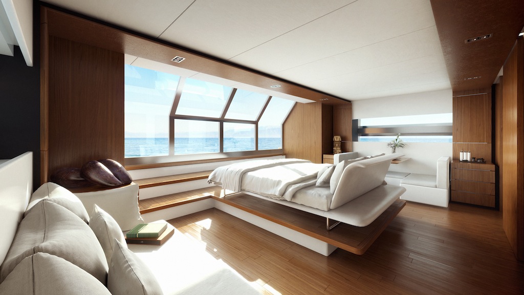 The first Wally//Ace superyacht, with a three cabin configuration, is scheduled for launch in March 2012 and includes such unique features as the Owners’ stateroom located aft, with an access to a private deck with an al fresco dining possibility and access to the sea. The same spacious cabin offers unparalleled views thanks to her large floor-to-ceiling windows, that can be seen on one of the images below. The vast and light interior and exterior spaces create an almost ‘loft living’ feeling on board of this distinctive yacht.