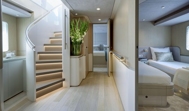 The interior showcases the work of designer Carla Guilhem and features soft curves in a cool palette of neutral tones and luxury finishes. The layout offers the ultimate in flexible accommodation both in the cabins and the main deck space which runs flush through from the bridge to the aft deck. The semi-open galley is forward to port adjacent to the dining area, while the aft space is occupied by the lounge and bar. Floor-to-ceiling windows allow light to flood in and glorious views to be glimpsed from every angle.