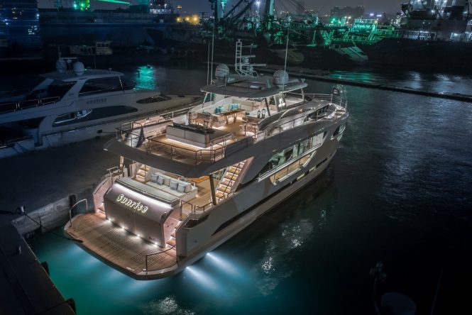 The superyacht sundeck is a perfect exterior living area to relax in the sun, sip on some cocktails and socialise. Sunrise offers alfresco dining option and outdoor lounge areas. The yacht is equipped with a swim platform making it easy to access the water and enjoy some toys.