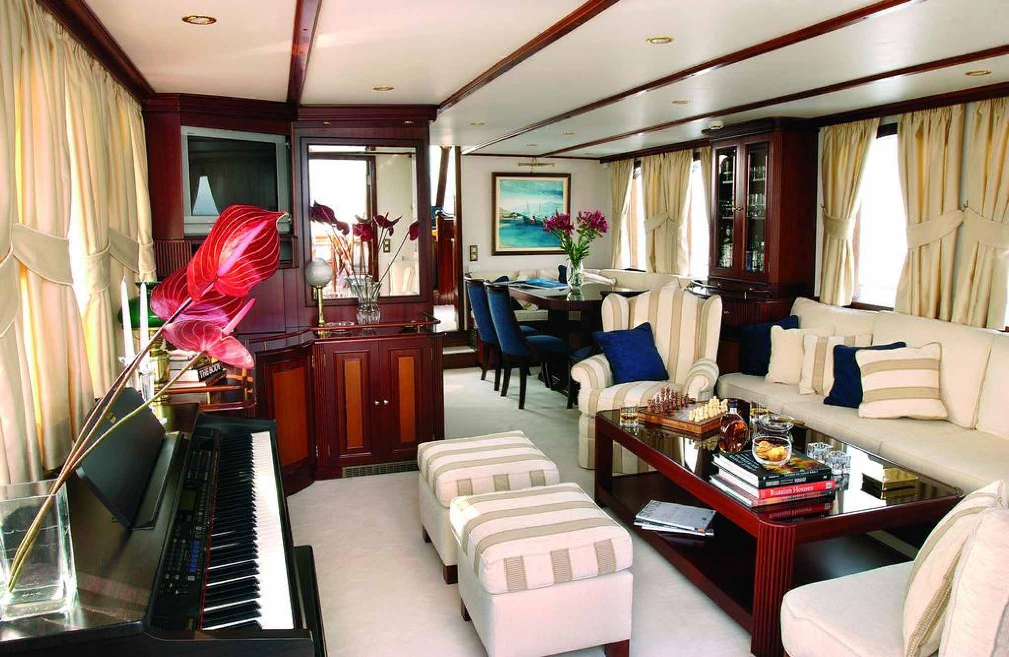 A raised salon and open plan formal dining area situated in the on-deck cabin house, offering a spacious lounge aft with ample seating, entertainment systems a piano, and dining forward. Large windows bring in the great natural light. Rich wood panels compliment the neutral fabrics, creating a fresh bright and airy atmosphere. Below decks are 5 cabins, comprising a master suite, 2 double cabins, 2 twin rooms, each with an additional Pullman berth.