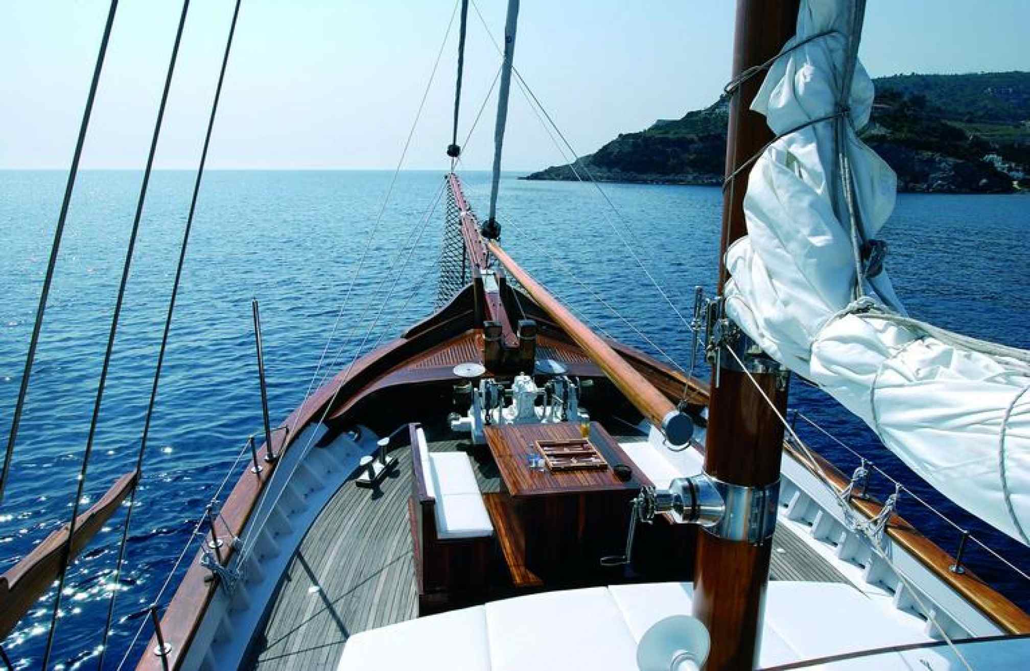 Teak decks aboard the gulet LIANA H are spacious. Charter guests have 2 alfresco dining options, one aft and the other forward, giving great versatility. Sunpads are available on the foredeck in a raised position, allowing for excellent views, while cruising the islands of Greece, soaking up the sunshine.
