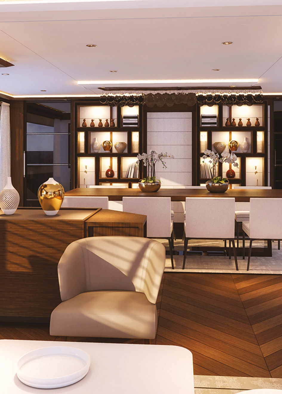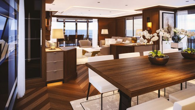 The main deck hosts a formal dining area, lounge and tender garage transformable into a beach club. Socialising and sunbathing area is on the foredeck, which offers Jacuzzi, sun pads, bar, alfresco dining area and seating.