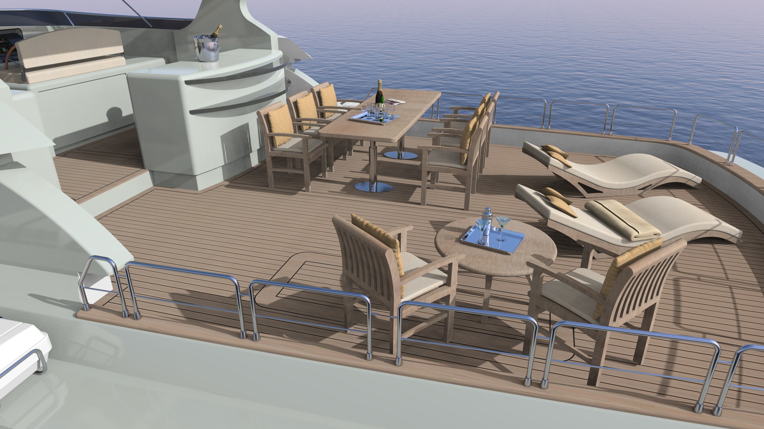 The outdoor areas have alfresco dining areas on the main deck aft and sundeck aft, the latter being exposed to the sunshine with a canvas cover available for shade. Sun loungers on the flybridge and a broad foredeck sunpad give guests a place to rest after a large meal accompanied by cocktails from the wet bar, with uninterrupted views of the anchorage to admire.