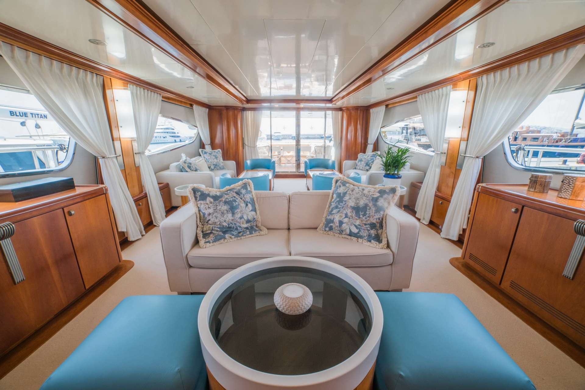Outdoor living is laid over 2 levels. The aft deck is shaded with an alfresco dining table, seating and access to the extended swim platform. An upper deck has sun pads and a further alfresco dining option. Her planing hull design boasts performance speeds of 23 – 32 knots, powered by twin MTU 2000hp engines.