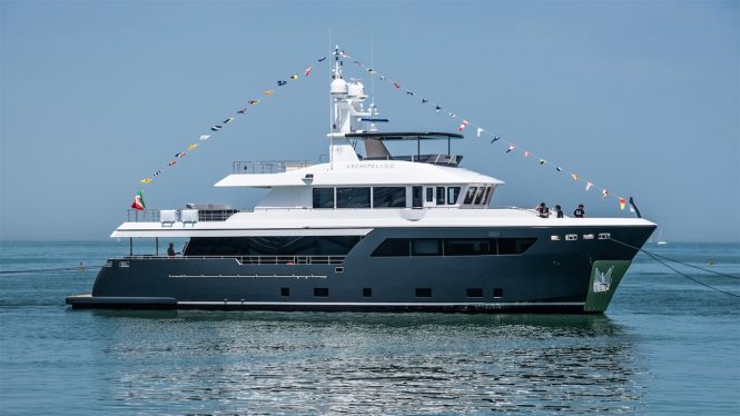 The fifth hull in the Darwin Class 102′ series, motor yacht ARCHIPELAGO, built by Cantiere Delle Marche has been launched in Italy. At 31 metres this fantastic explorer yacht features contemporary exterior design by Hydro Tec, who also took care of the naval architecture. Francesco Guida was responsible for the interiors, which has been designed to provide outstanding experience at the sea with some tones of white, green and blue.