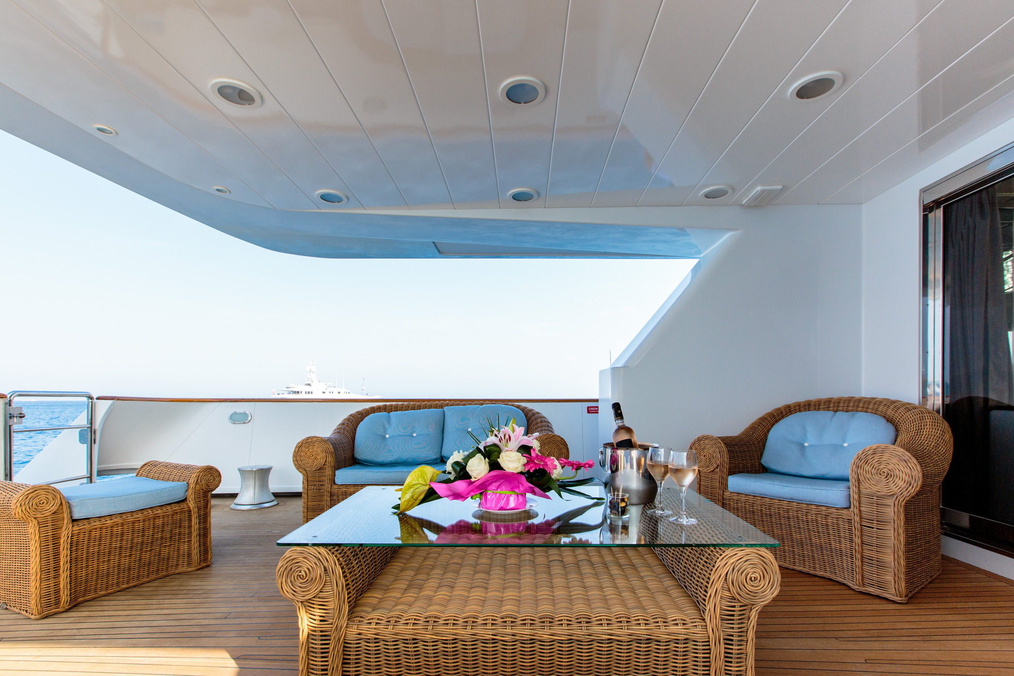 On deck, PAS ENCORE has plenty of areas to relax and unwind. The main aft deck offers oversized wicker furnishings, shade, access to the salon as well as the swim platform. Side decks lead to a well-sized foredeck and intimate seating area. On the sundeck, there is an alfresco dining option, seating, double sun pad and partial shade when required.