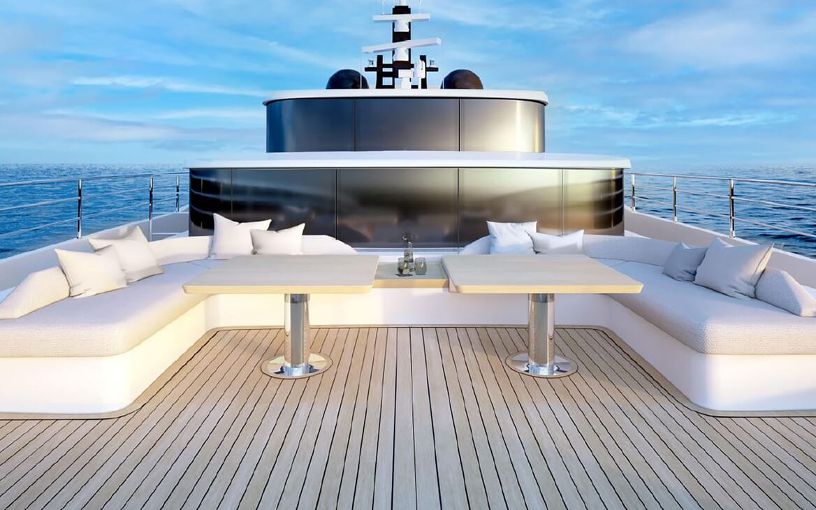 Sociable al fresco spaces across the flybridge sun deck are complemented by a generous water’s edge swim platform so guests can relax on board with a cocktail or venture out on the water toys which include everything from high-speed jet skis to more sedate paddleboards.