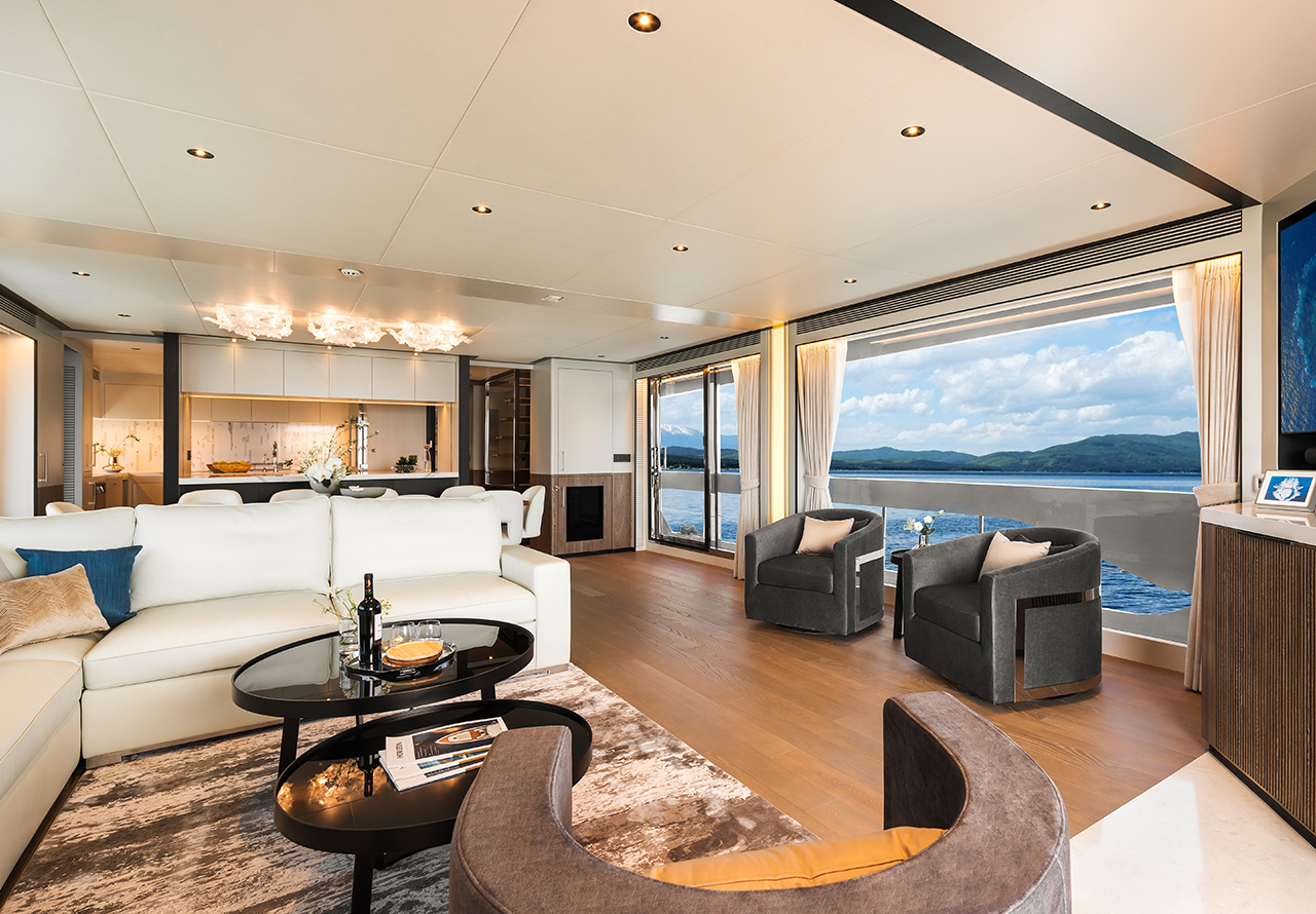The elegant and understated décor creates a warm and welcoming atmosphere in a space which still exudes sophistication. The main salon has an impressive dining area which can be configured as a formal dining table and chairs or casual high-top table with stools and sit up galley bench.