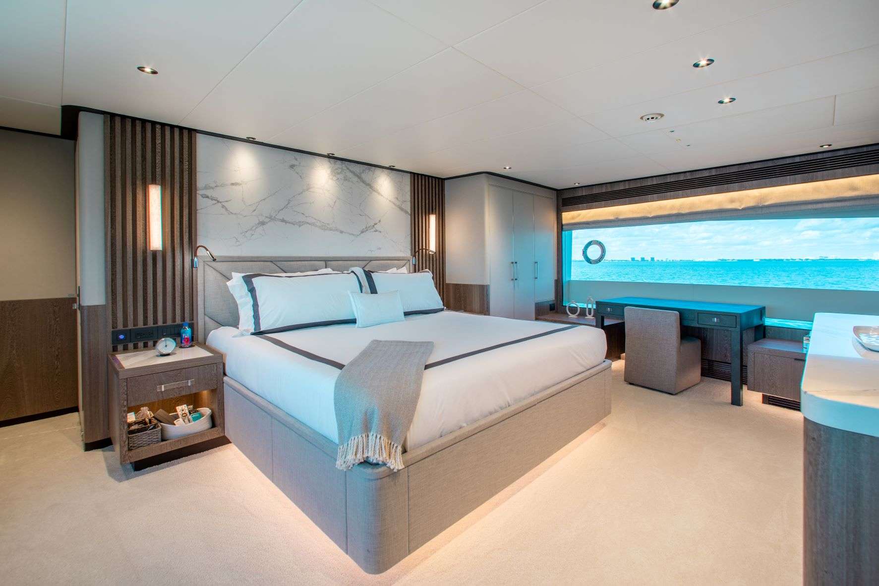 Guests will love the restful and private staterooms which include a main deck master with stunning, contemporary his-and-hers bathrooms with central shower.