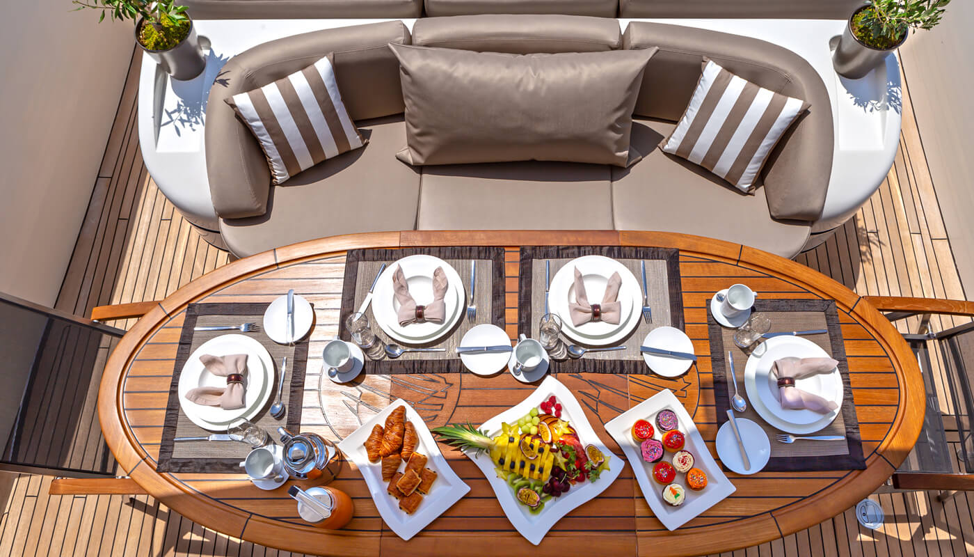 Sleek and sporty, she boasts excellent interior and exterior living, with a versatile layout that flows beautifully. The contemporary salon with its light fabrics, warm woods and ample seating invites an elegant and relaxing atmosphere. Opposing sofas, with adjustable tables, make the space great for socializing and enjoying evening cocktails, in full air-conditioning. Further forward is the open plan formal dining table. The salon includes a retractable roof and full audio/visual equipment.