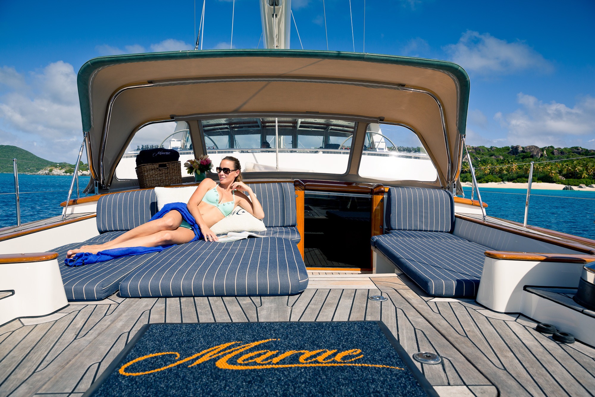 The Alloy yacht has full teak decks that provide a number of relaxing areas while on charter, including an aft deck with alfresco dining, seating and optional shade, plus a spacious foredeck, ideal for soaking up the Caribbean sunshine. On the transom is a fold out swim platform where guests can enjoy the good selection of water toys available.